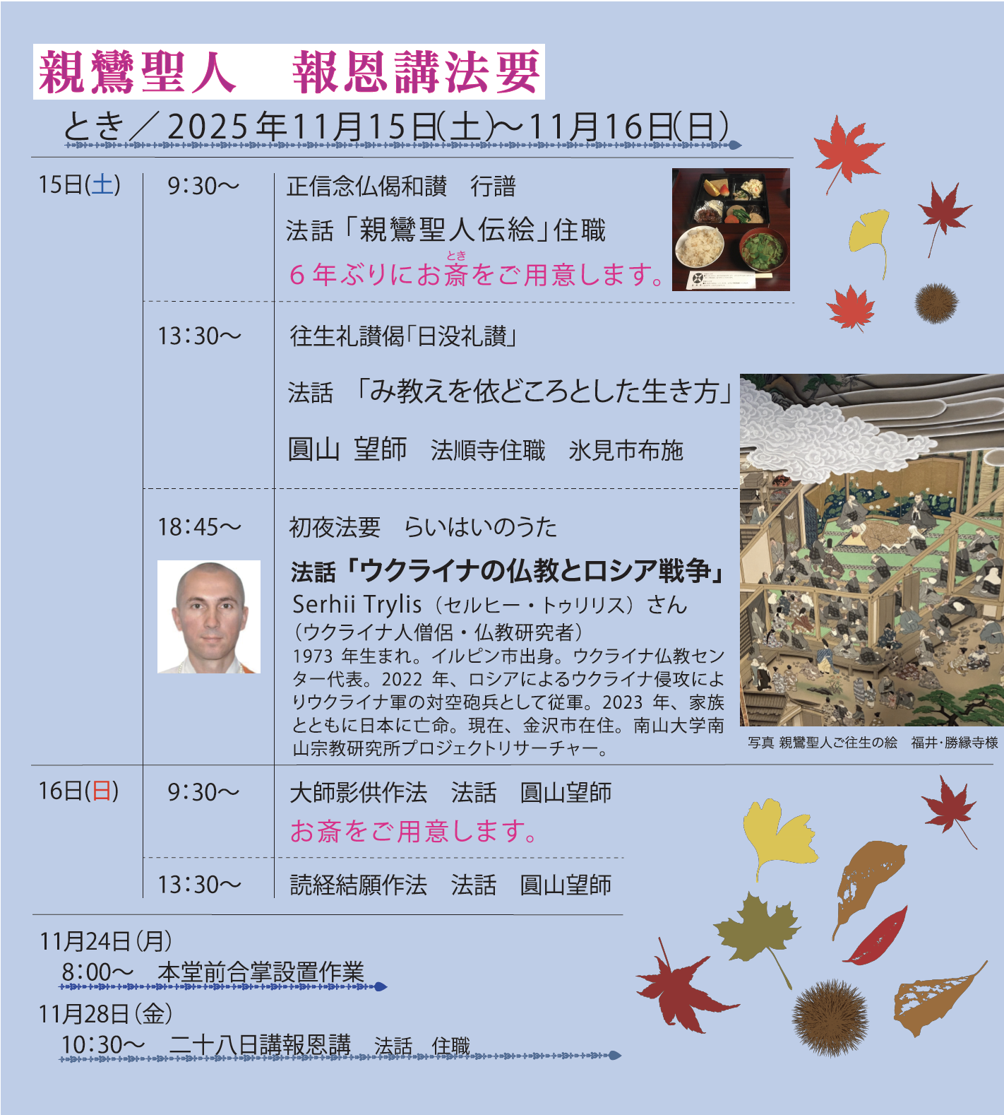 また、15日の初夜法要では、ウクライナ人僧侶のセルヒー・トゥリリスさんをお招きして、ウクライナのこと、ロシアのこと、戦争のこと、ウクライナの仏教のことなどお聞きして、理解を深めたいと思います。